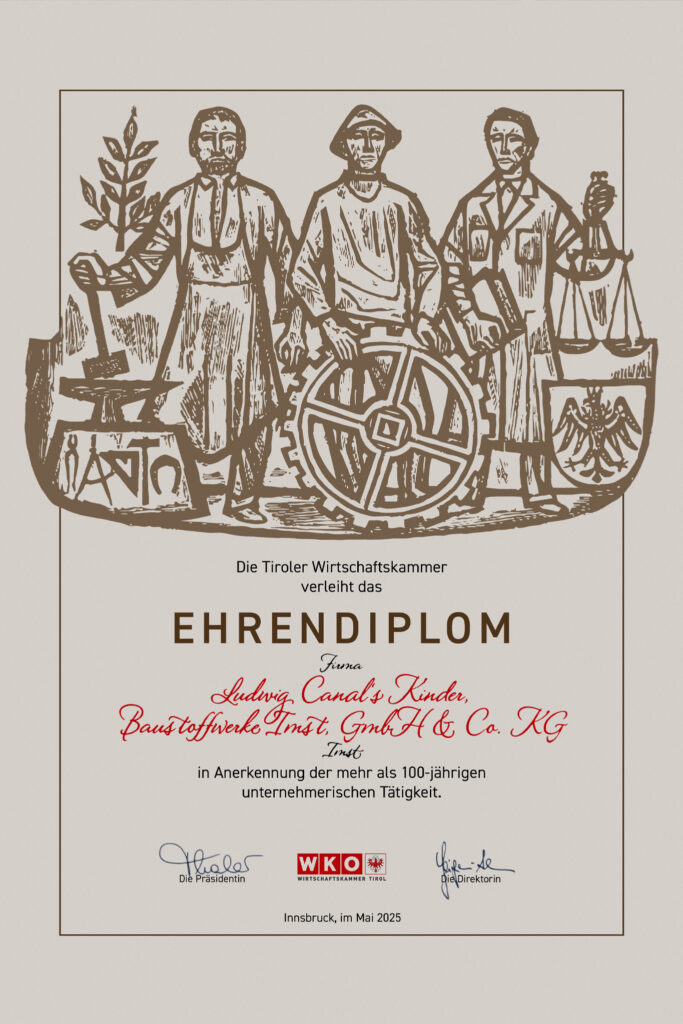 Das Ehrendiplom würdigt zudem den nachhaltigen Beitrag des Unternehmens zur regionalen Bauwirtschaft im Tiroler Oberland. Generationenübergreifendes Unternehmertum, verantwortungsvolles Handeln und die enge Verbindung zur Region haben Canal zu einem festen Bestandteil der lokalen Wirtschaftsstruktur gemacht. Hinter dieser Auszeichnung stehen nicht nur Zahlen und Meilensteine, sondern vor allem Menschen: die Unternehmensführung, Mitarbeiterinnen und Mitarbeiter sowie langjährige Partner, die das Unternehmen über Jahrzehnte hinweg begleitet, mitgestaltet und weiterentwickelt haben. Das Ehrendiplom ist damit ein sichtbares Zeichen der Anerkennung für gelebte Beständigkeit, regionale Verantwortung und unternehmerische Weitsicht.